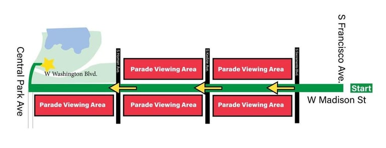 Floats, bands, and groups proceed West on Madison Street, from Sacramento Blvd to Central Park Ave.